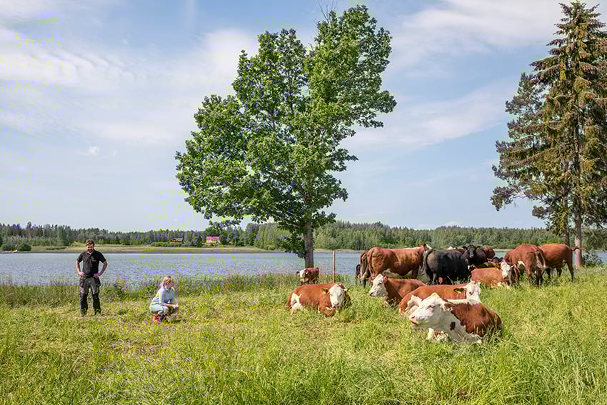 Herefordeista ja anguksista koostuva karja viettää noin puolet vuodesta laitumilla, joista kaksi on Kymijoen tuntumassa.