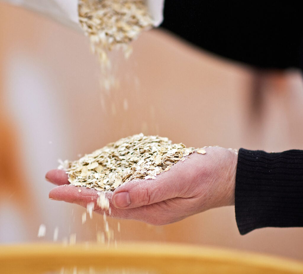 Kauran tuhti, ruokaisa aromi leijuu sieraimiin myllysalissa. Aikansa prosessissa puhistuaan hiutaleet laskeutuvat korkean myllylaitoksen alimpaan rööriin, josta Teemu Kinnari sieppaa kourallisen laaduntarkastukseen. Rakenne ja koko täydellinen, väri passeli, ja maku juuri sitä mitä pitääkin, isäntä tuumii tyytyväisenä.