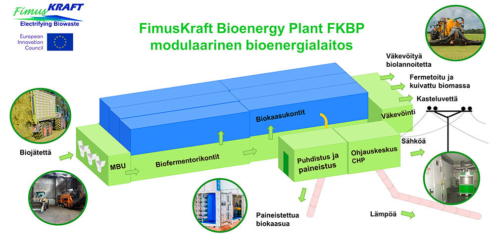 FimusKraft FKBP -biokaasulaitos koostuu rinnakkaisista radoista, joissa on kaksi merikonttia peräkkäin. Eri radoilla voidaan käsitellä erilaisia syötteitä, liete- tai kuivalantaa, kasvi- tai teurasjätteitä. Liete on esikäsiteltävä 20 %:n kuiva-ainepitoisuuteen puolikuivaa fermentointiprosessia varten. Prosessia ohjataan hallitusti, kun kontin sisällä oleva sekoitin työntää materiaalia vähitellen eteenpäin. Laitos tuottaa mahdollisimman puhdasta eli lähes rikkivedytöntä kaasua. Prosessin tulisi toimia jatkuvasti, joten 120 lehmän tilan syötemäärään sopii kahden radan 60 kW lämpöä ja 30 kW sähköä tuottava laitos. Sen hintaluokka on 400 000 €, takaisinmaksuaika 4–6 vuotta.